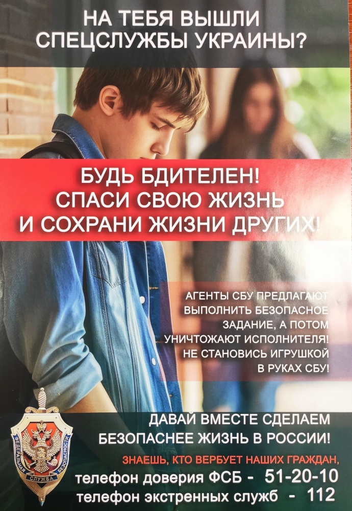 На тебя вышли спецслужбы Украины? Агенты СБУ предлагают выполнить безопасное задание? С чем же это связано и что можно поделать? Пока российская армия борется с противником на реальном фронте, украинские спецслужбы активно «воюют» в виртуальном пространстве. В последнее время как из ведра посыпались сообщения о задержании россиян за сотрудничество с СБУ. Предателей ловят по всей стране. По заданию украинской разведки и западных кураторов изменники родины занимаются поджогами объектов Минобороны, МВД, РЖД, передают данные о месторасположении стратегически важных объектов. В общем, одно преступление тяжелее другого. Как помешать вовлечению? Главное правило и защита от подобных манипуляций в интернете — перепроверка достоверности любой получаемой информации. Например, можно поискать информацию о телеграм-канале, в который вас пригласили вступить, отзывы людей о нем или мероприятиях, которые могут там описываться. Для защиты личных данных от киберпреступников и вражеских спецслужб тоже есть определённые правила. Прежде всего, необходимо всегда контролировать всю информацию, которую публикуете в сети. Абсолютно все, что однажды было оцифровано - фотография, сообщение и т.д. - даже после удаления продолжает «жить» в виртуальном пространстве. Будь бдителен! Не становись игрушкой в руках СБУ! Спаси свою жизнь и сохрани жизни других! Телефон доверия ФСБ – 51-20-10 Телефон экстренных служб - 112.