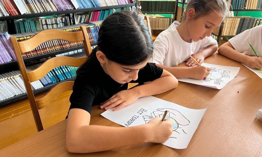 В библиотеке был проведен тематический урок, завершившийся выставкой детских рисунков под названием «Мы против террора. Дети за мир».